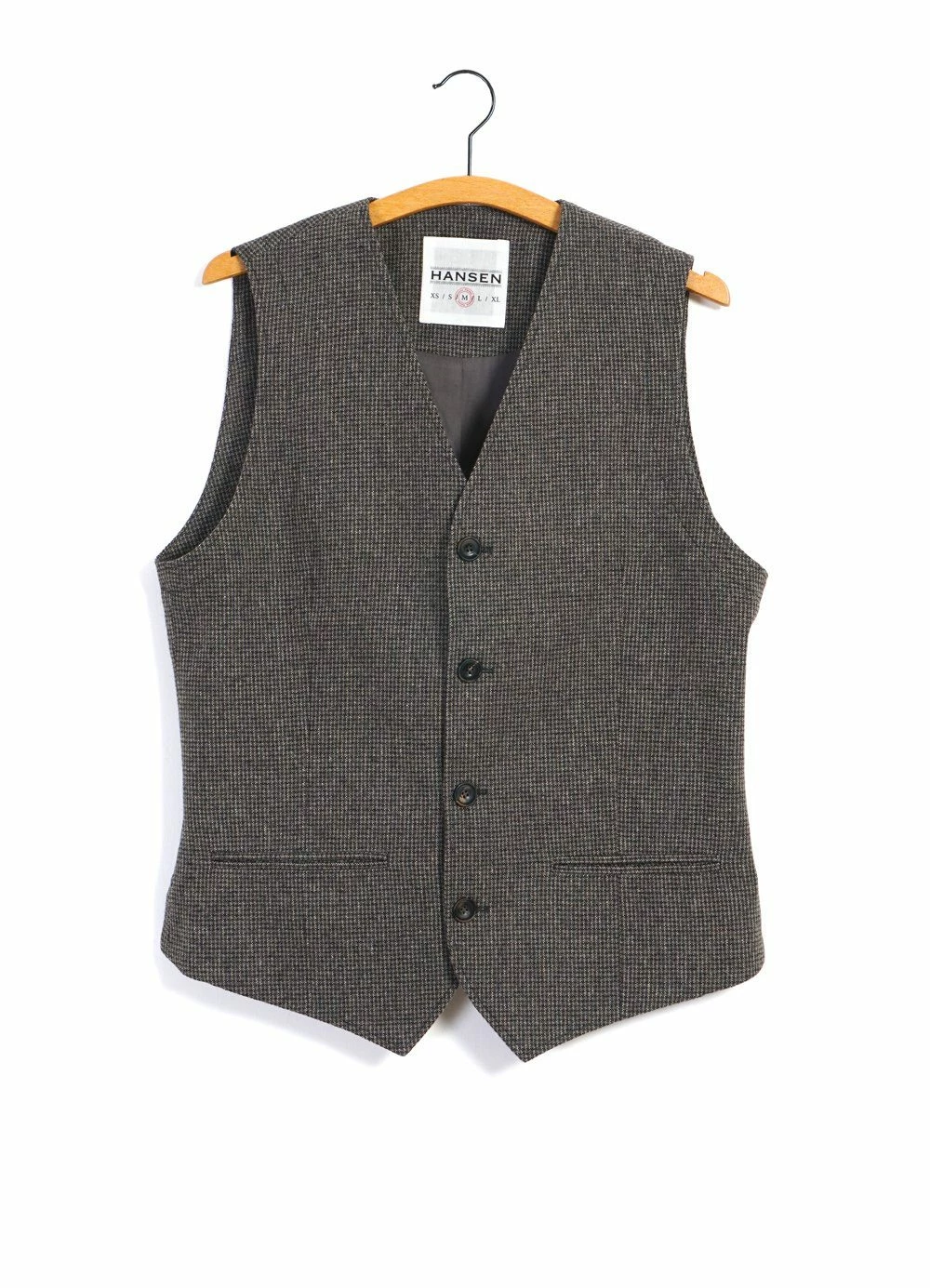 DANIEL is a 4-button waistcoat with a regular neck drop, button size-regulators on the back and welted pockets on the front. It can be worn separately or as part of HANSEN’s well-known casual looking three-piece suits.