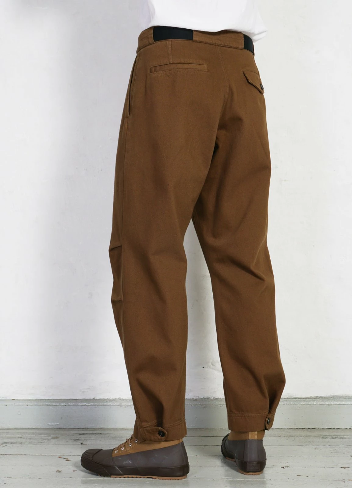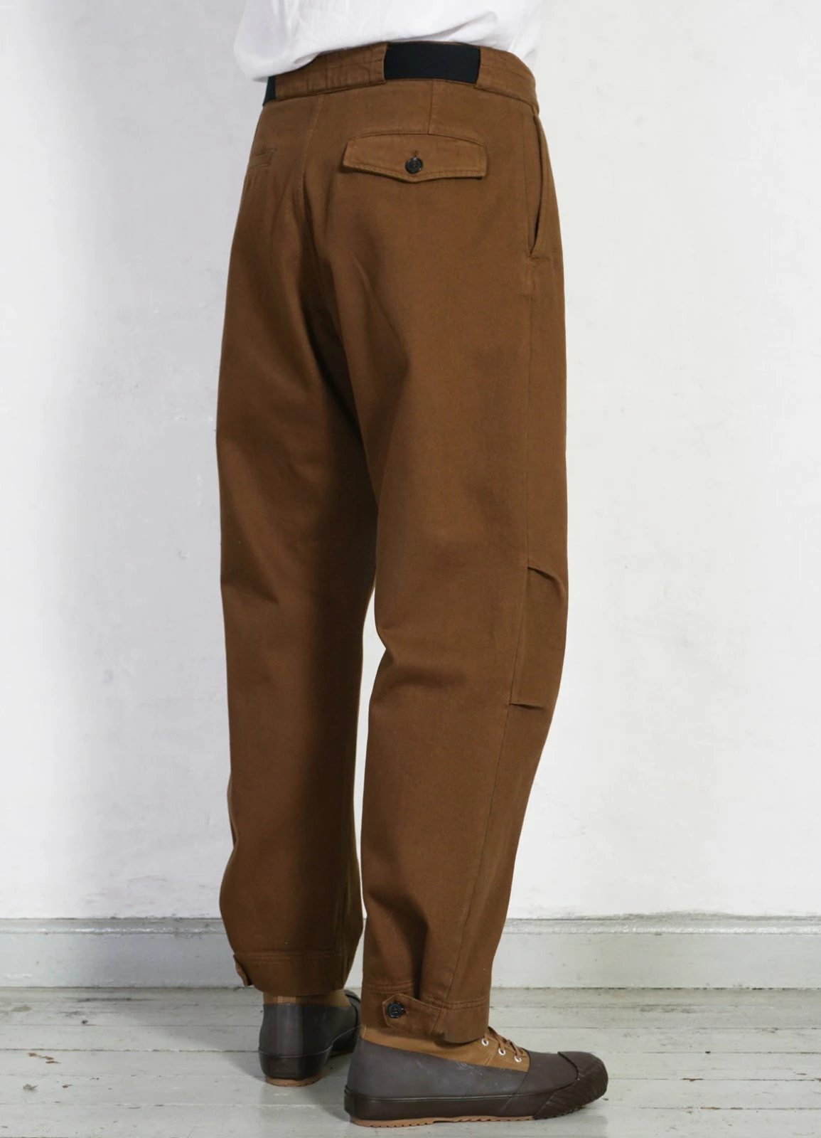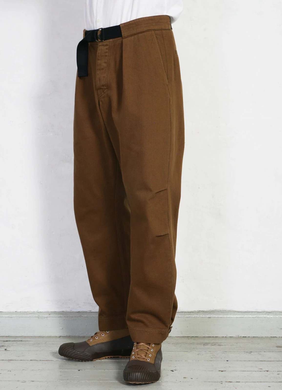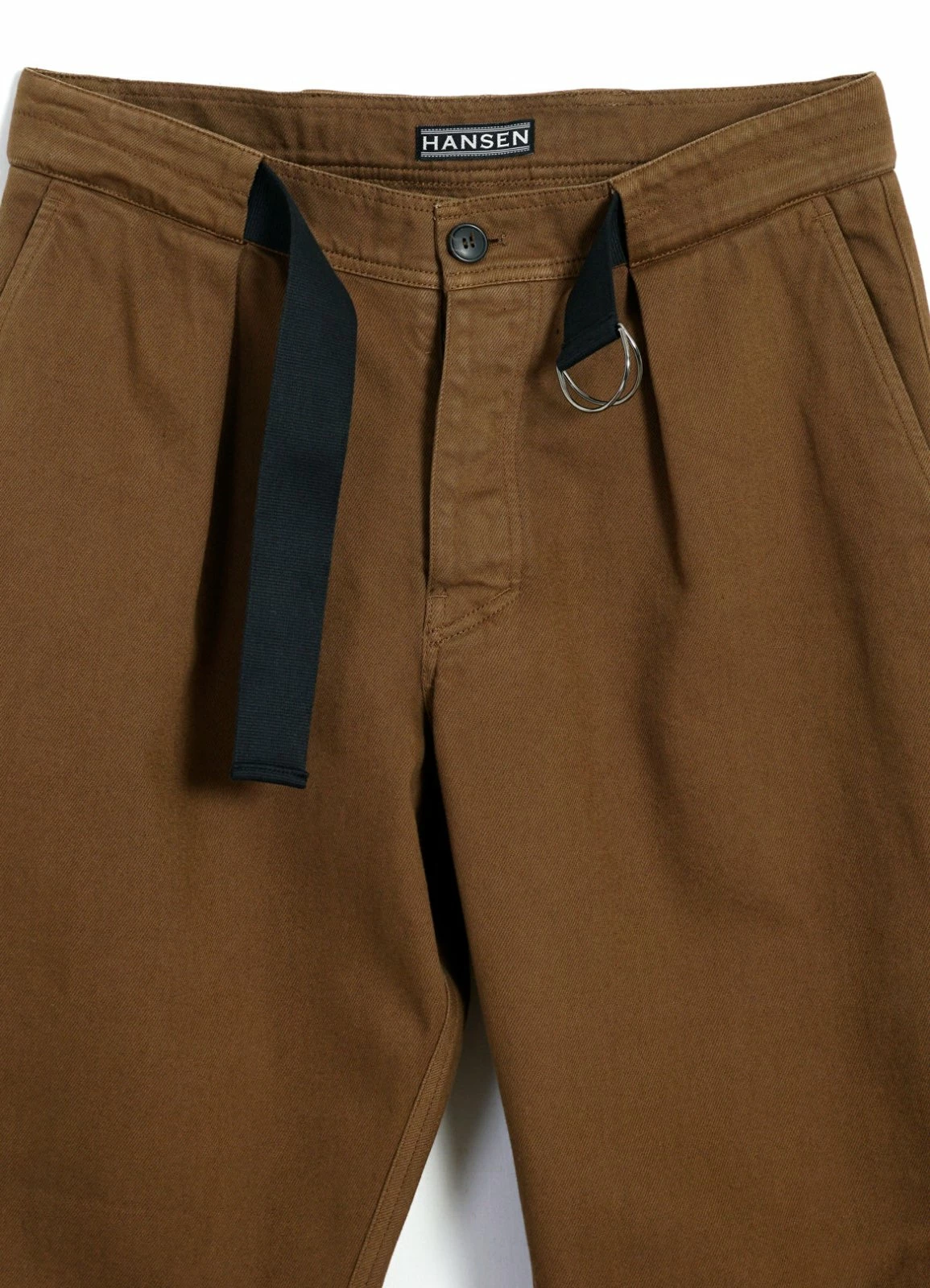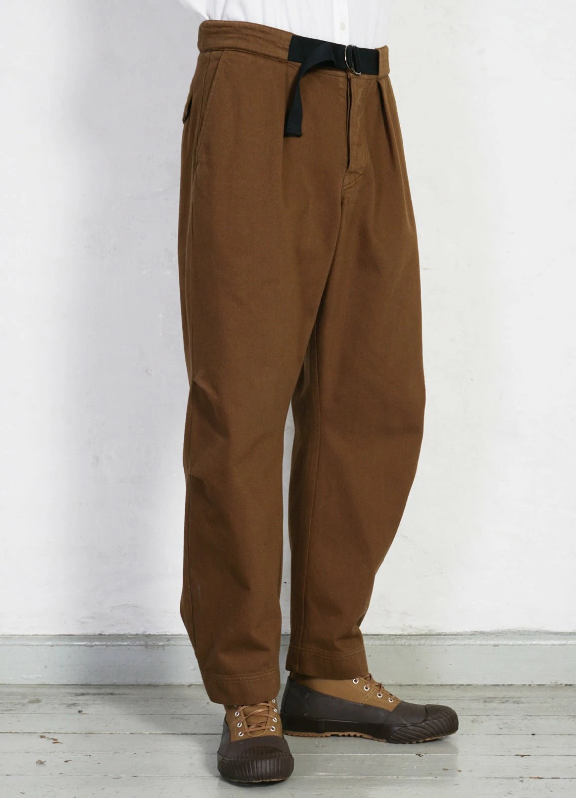 KARLO is a wide cut pleated trouser with a heavy black cotton ribbon belt. It has pleats at the knees and a button width regulator at the bottom leg. The front pockets are slanted and the back pockets are welted.