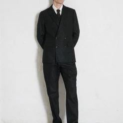It is made of a yarn dyed Italian fabric called delavé. Lavé, meaning washed in Italian, the yarn has been washed before woven. Combined with the herring-bone weave the fabric gets an uneven vivid structure. For comfort there is some elastan woven in the fabric.