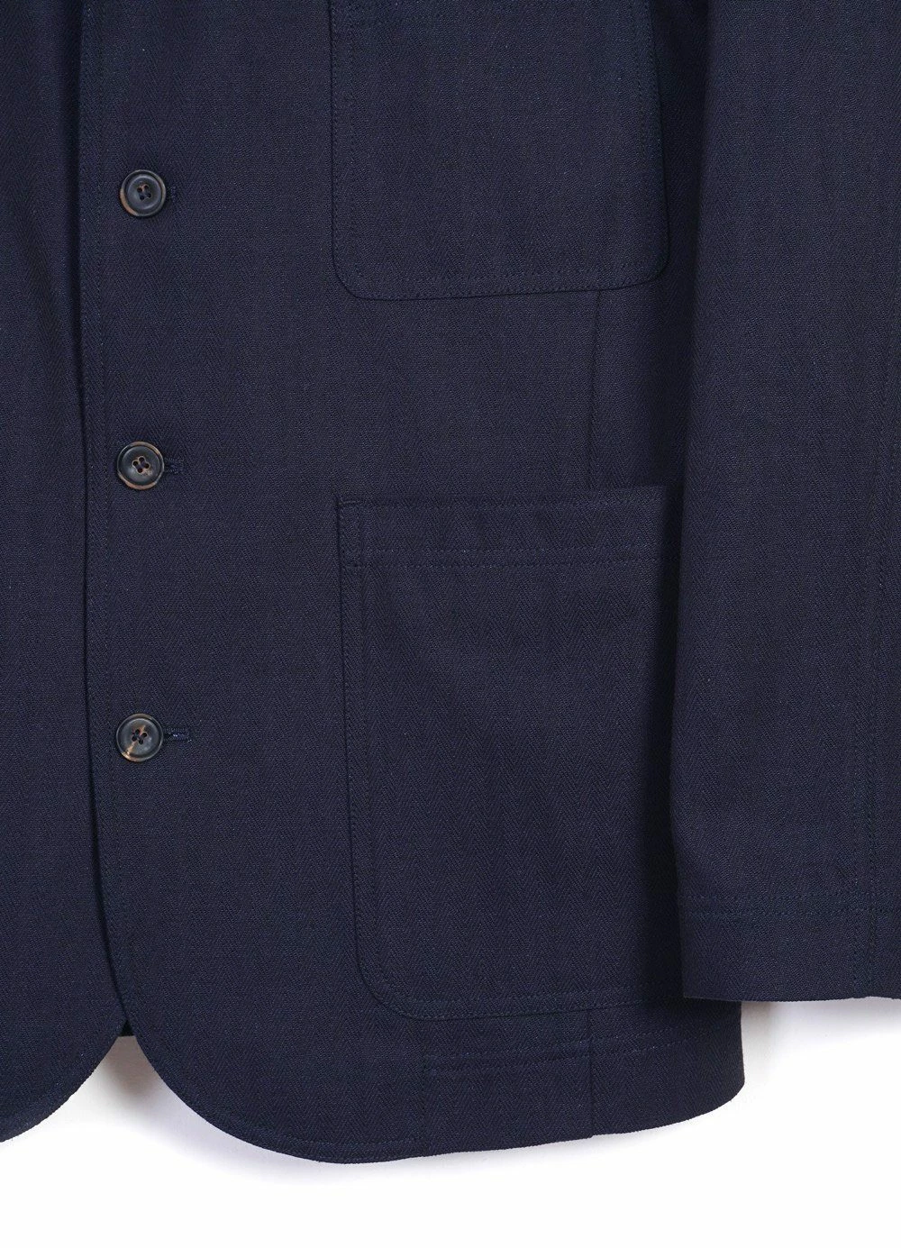 Italian, natural, indigo-dyed, herringbone fabric made of cotton. This fabric has a crisp,
