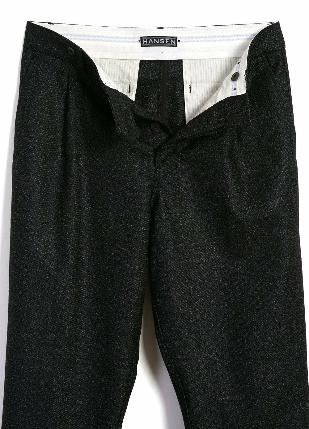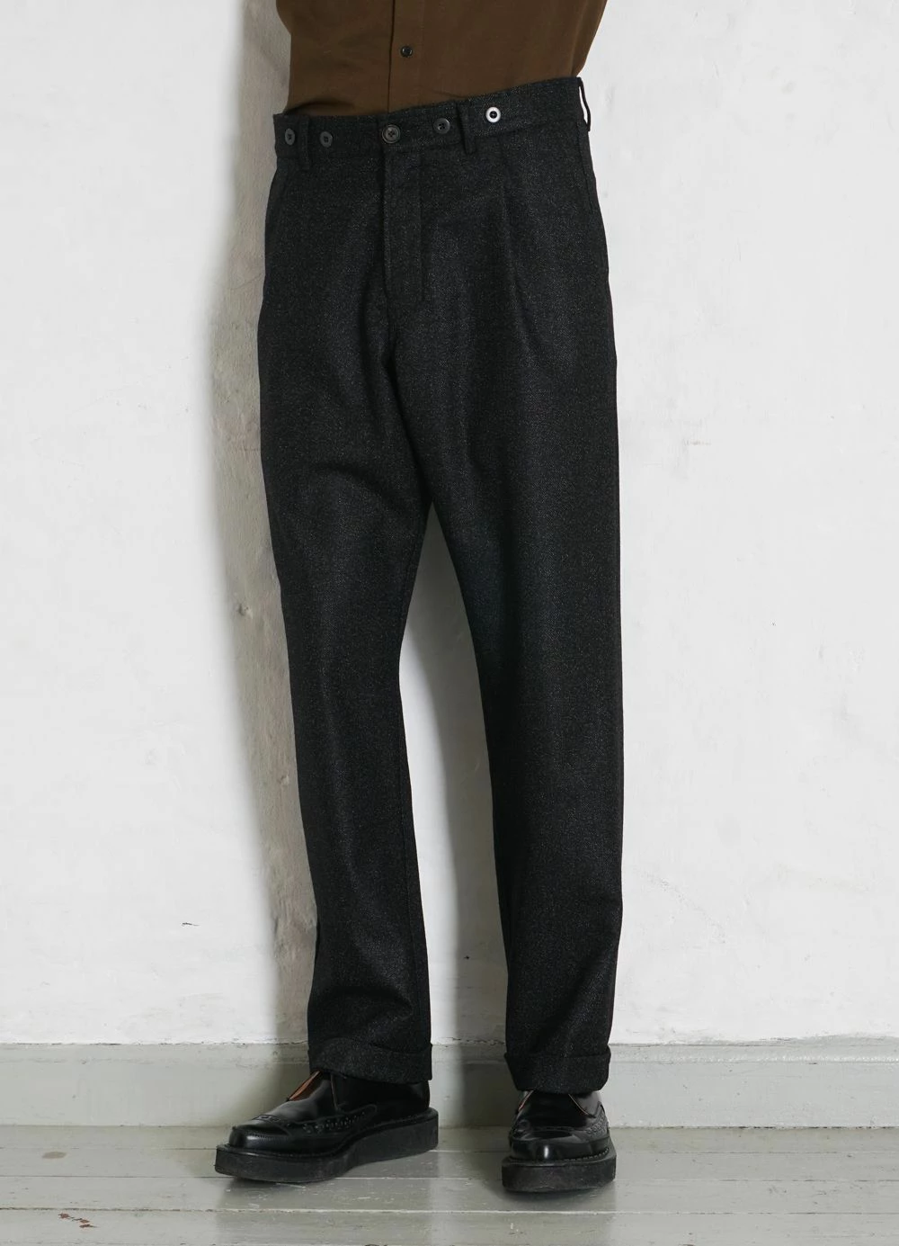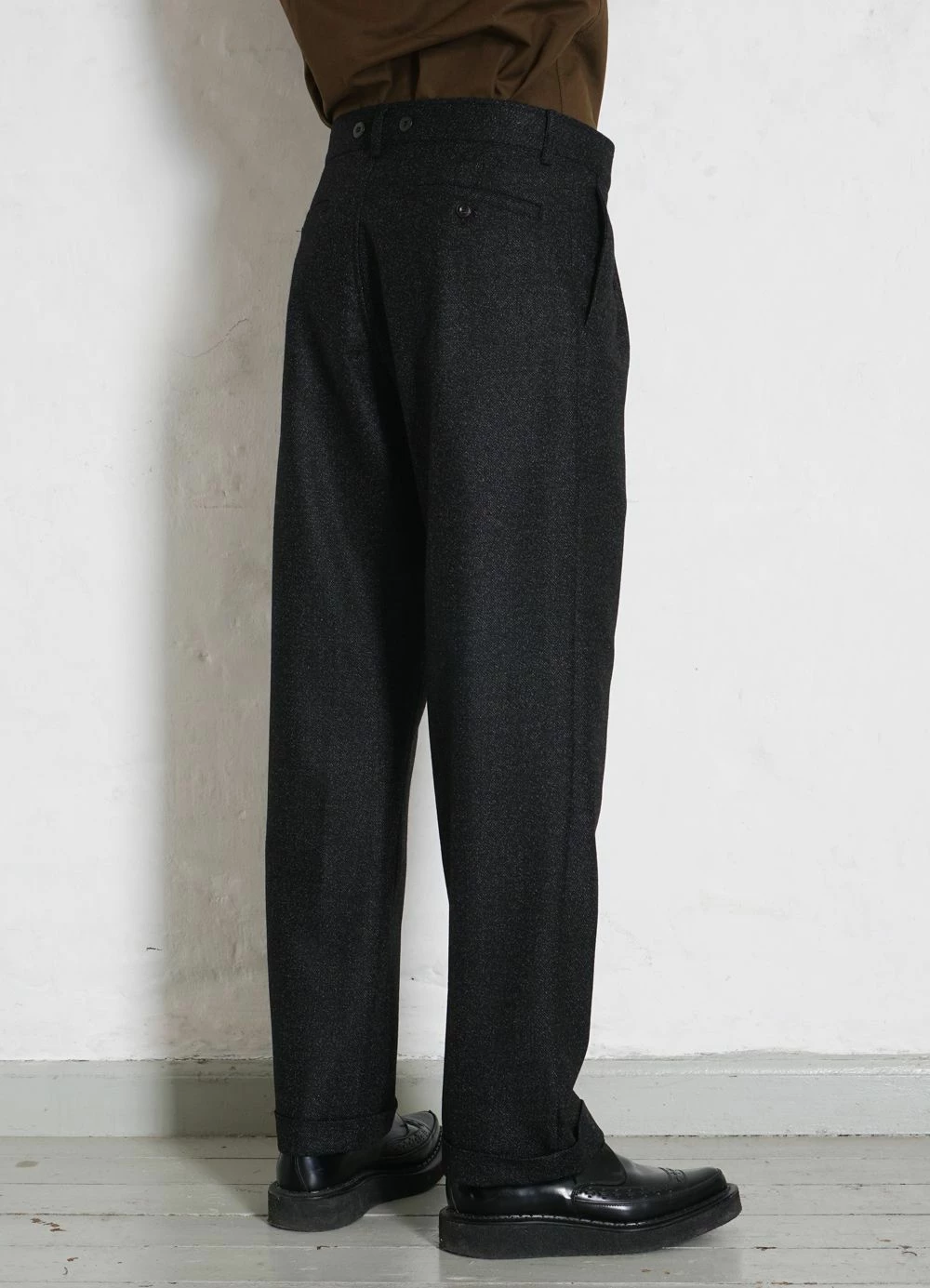 SUNE is loosely fitted with wide cut legs, pleats, suspender buttons, folded cuffs and a rubber grip waistband.
