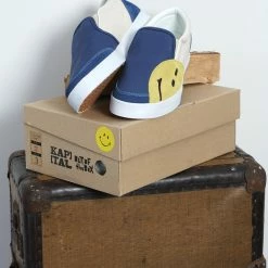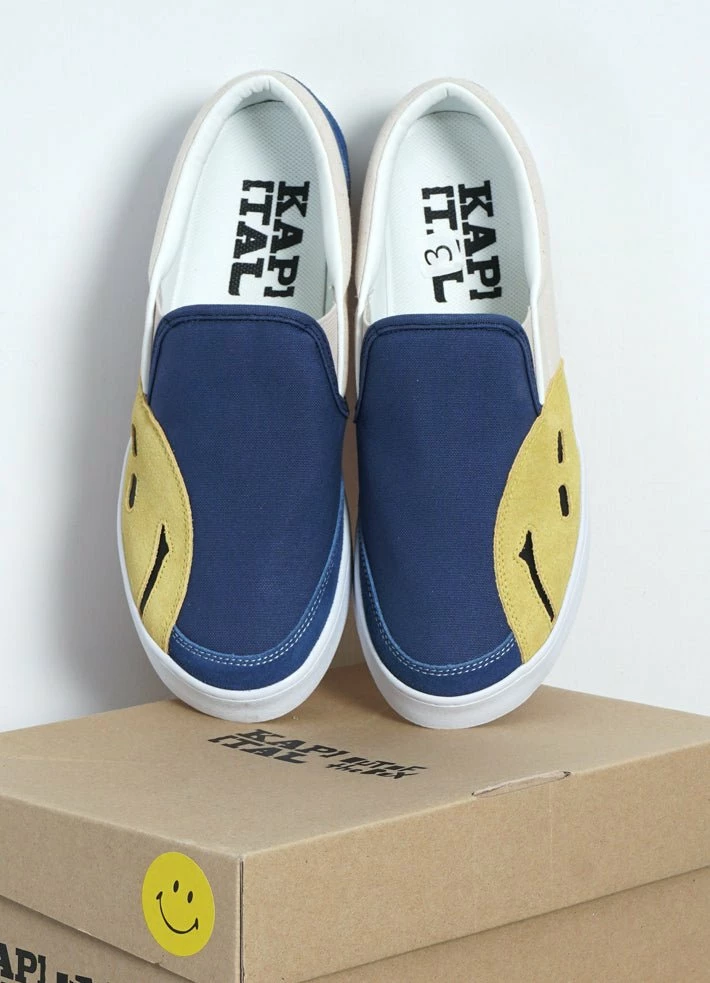 Simple slip-on shoe in a premium thick cotton canvas with suede mudguard, heel and Kapital Rain Smile detail. Leather lined.Â